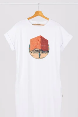 - Dizainas: laisvo, tiesaus kirpimo marškinėliai su trumpomis rankovėmis ir skeltukais šonuose. Nugaros dalis šiek tiek prailginta, o rankovės – tvarkingai apsiūtos (kraštai neatlenkti į išorę). Modelį puošia išskirtinė spauda.