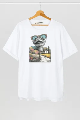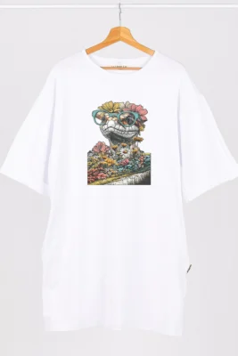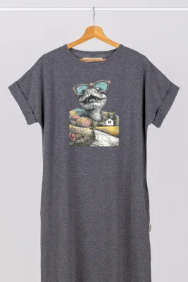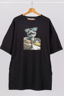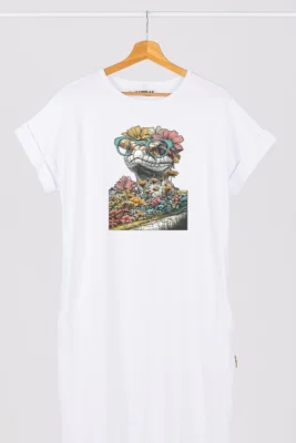 - Dizainas: laisvo, tiesaus kirpimo marškinėliai su trumpomis rankovėmis ir skeltukais šonuose. Nugaros dalis šiek tiek prailginta, o rankovės – tvarkingai apsiūtos (kraštai neatlenkti į išorę). Modelį puošia išskirtinė spauda.