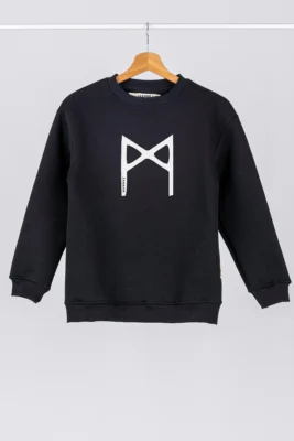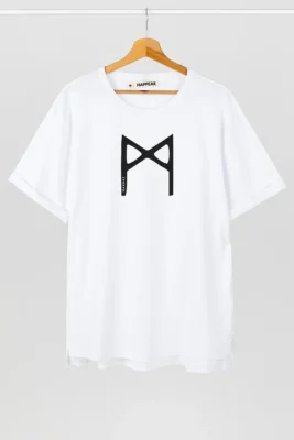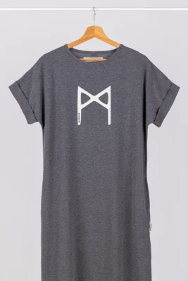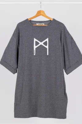 Šie lengvi ir patogūs marškinėliai leidžia vaikams laisvai judėti – nesvarbu, ar jie bėga, karstosi, šokinėja, ar tiesiog smagiai leidžia laiką. Marškinėliai yra tiesaus, laisvo kirpimo, minimalistinio dizaino ir trumpomis rankovėmis. Ant marškinėlių esantis minimalistinis Mannaz runos simbolis suteikia subtilų ir prasmingą atspalvį. Mannaz simbolizuoja žmogų, savimonę ir bendruomenę. Ji atspindi žmogiškumą, kolektyvinę tapatybę bei santykius su kitais bei kviečia kurti ryšius ir puoselėti bendruomenę.