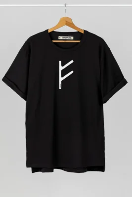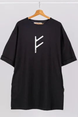 Lengvai krintanti, elegantiška ilga suknelė su trumpomis rankovėmis, šoniniais skeltukais ir kišenėmis. Išskirtinumo jai suteikia unikalus piešinys su Fehu runos simboliu – klestėjimo, gausos ir vidinio turto ženklu, kviečiančiu gyventi sąmoningai ir prasmingai.