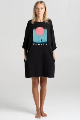 Ilga suknelė – puikus pasirinkimas toms, kurios vertina eleganciją ir patogumą tiek kasdienai, tiek ypatingoms progoms. Jos akcentas – piešinys, perteikiantis savitą idėją ir traukiantis akį. Suknelė išsiskiria trumpomis rankovėmis, tiesiu, laisvu kirpimu ir skeltukais šonuose, suteikiančiais judėjimo laisvę ir lengvumą. Praktiškos šoninės kišenės prideda funkcionalumo, o minkštas, aukštos kokybės medvilnės ir elastano audinys užtikrina komfortą.