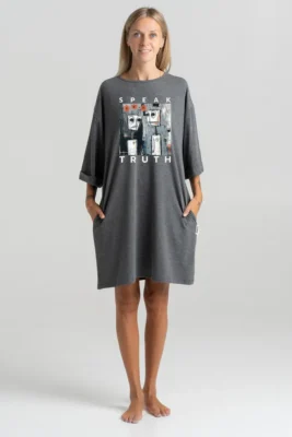 This long dress is a perfect choice for those who value elegance and comfort, whether for everyday wear or special occasions. Its highlight is the print design, which conveys a unique idea and catches the eye. The dress has short sleeves, a straight, loose fit, and side slits that offer freedom of movement and a light feel. Practical side pockets add functionality, while the soft, high-quality cotton and elastane fabric ensure comfort.