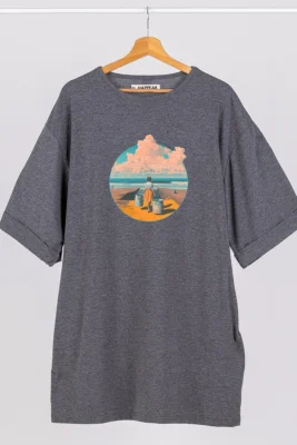 - Design: Loose, straight-cut T-shirt with short sleeves and side slits. The back is slightly extended, and the sleeves have neat hems (edges are not folded outward). The design features a distinctive print.