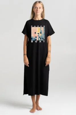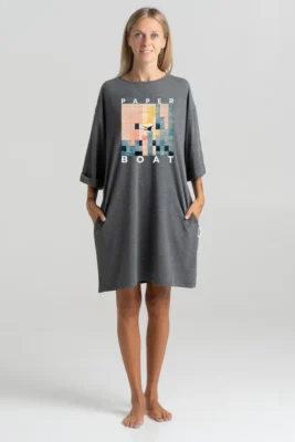 - Design: Relaxed, straight-cut T-shirt with short sleeves, featuring a unique graphic print. The shirt has side slits and a slightly extended back hem, adding a modern touch to the design.