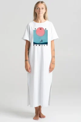 - Design: Relaxed, straight-cut T-shirt with short sleeves, featuring a unique graphic print. The shirt has side slits and a slightly extended back hem, adding a modern touch to the design.